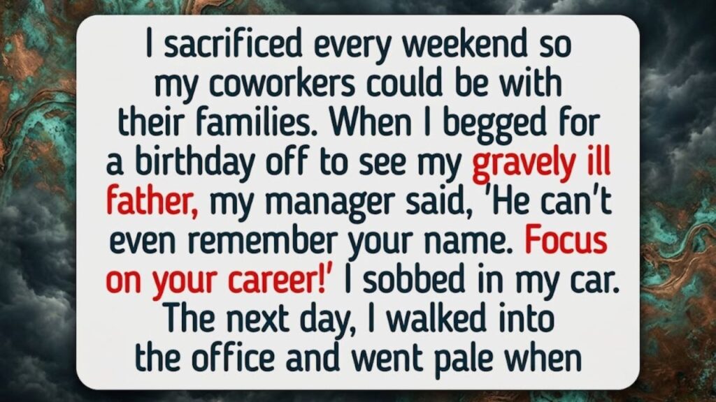 I spent nearly every weekend for two years covering shifts so my coworkers could be with their families. I never complained or kept count. When I finally asked for one day off — my birthday — to visit my seriously ill father, my manager dismissed it and told me to focus on work. I sat in my car and cried. The next morning, I returned to find my desk covered in flowers. My team stood there with a handwritten card: “Go see your dad. We’ve got everything covered.” They had rearranged the entire schedule themselves. That day, they gave me something no authority figure had — permission to be human. It was the last birthday I spent with my father.