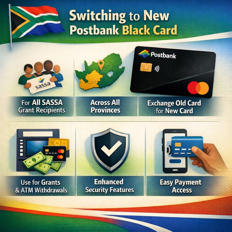 From mid-April to July 2026, Postbank and SASSA will help the last people who got grants switch from their old gold cards to their new Postbank Black Cards.